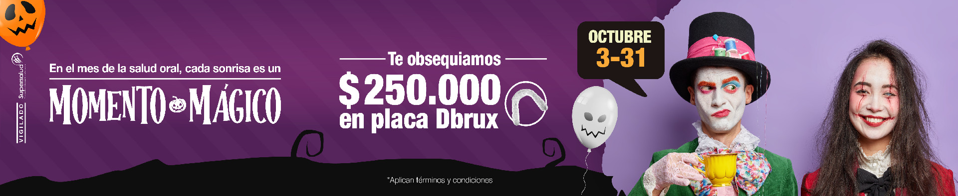 Te obsequiamos $250.000 para tu Placa neuromiorelajante Dbrux. El descuento aplica para la compra y facturación del 100% del tratamiento. No acumulable con otros descuentos o promociones. No aplica para pagos parciales. Los beneficios no se suman en el mismo procedimiento, pero sí en tratamientos diferentes. No acumulable con financiación DFS. Aplican condiciones y restricciones.