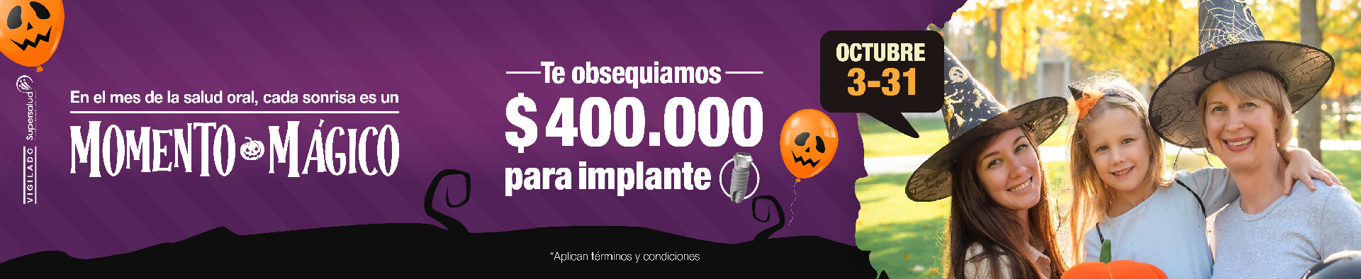 El bono por $400.000 Incluye cirugía de colocación de implante, implante dental de titanio biocompatible, 2da fase quirúrgica, tapón de cicatrización y radiografías de control, no incluye provisionales. Aplica para la facturación, compra y pago del 100% del implante. No acumulable con otros descuentos o promociones. No aplica para pagos parciales. Los descuentos no se suman con otros descuentos en el mismo procedimiento, se pueden combinar campañas de descuento sobre tratamientos diferentes. No acumulable con financiación DFS. Aplican condiciones y restricciones.