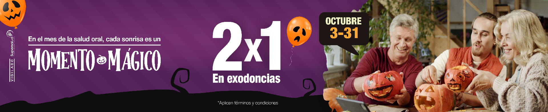 Aplica para la compra de dos exodoncias, la segunda es gratis. El descuento aplica para la compra y facturación del 100% del tratamiento. No acumulable con otros descuentos o promociones. No aplica para pagos parciales. Los beneficios no se suman en el mismo procedimiento, pero pueden combinarse con campañas sobre tratamientos diferentes. No acumulable con financiación DFS. Aplican condiciones y restricciones.