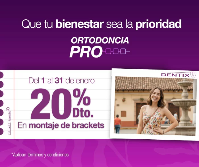 Promoción válida del 1 al 31 de enero del 2026. Aplica el 20% de descuento en el montaje de brackets 3M Gemini, Smartclip, Orthometric Ultrap y Advance en montajes de dos arcadas e incluye estudio cefalométrico. El descuento aplica para la compra y facturación del 100% del tratamiento. No acumulable con otros descuentos o promociones. No aplica para pagos parciales. Los beneficios no se suman en el mismo procedimiento, pero sí pueden combinarse con campañas sobre tratamientos diferentes. No acumulable con financiación DFS. Ni Welli tasa cero o subconvencionada. Aplican condiciones y restricciones