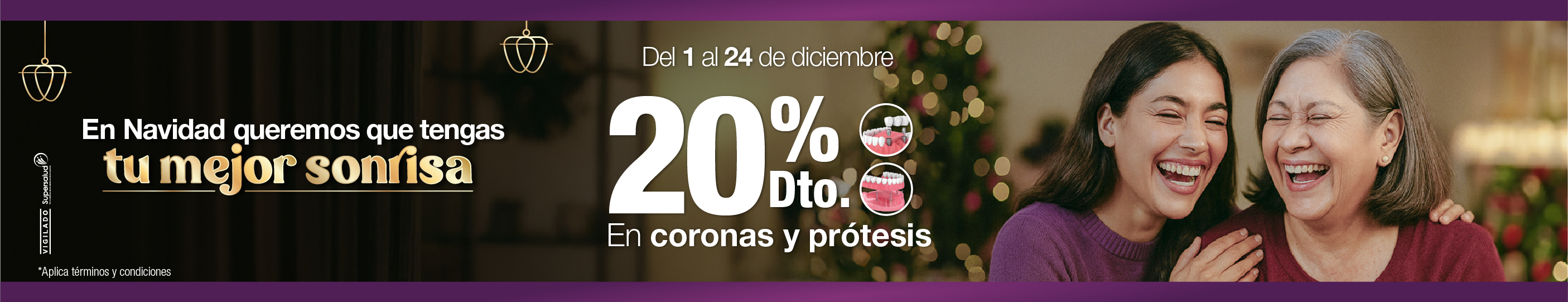 Promoción válida del 1 al 24 de diciembre de 2025. Aplica para el 20% de descuento sobre el valor total del tratamiento de prótesis y coronas. Aplica para : prótesis metálica removible, prótesis parcial mucosoportada (de 1 a 6 dientes o más de 6 dientes), prótesis temporal (de 1 a 3 dientes, de 4 a 8 dientes o total) y prótesis total superior o inferior. para coronas incluye: corona cerámica sobre diente posterior con escaneo digital (Ceramic Crown), corona de silicato de litio E-Max, corona metal-cerámica sobre implante, corona de zirconio sobre implante o diente, y corona metal-cerámica individual o para prótesis parcial fija.El descuento aplica para la compra y facturación del 100% del tratamiento. No acumulable con otros descuentos o promociones. No aplica para pagos parciales. Los beneficios no se suman en el mismo procedimiento, pero pueden combinarse con campañas sobre tratamientos diferentes. No acumulable con financiación DFS. Ni Welli tasa cero o subconvencionada. Aplican condiciones y restricciones.