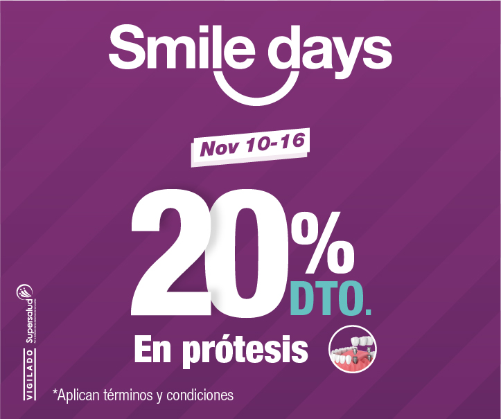 Promoción válida del 10 al 16 de noviembre de 2025. Aplica el 20% de descuento en tratamientos de prótesis dentales. Incluye: prótesis metálica removible, prótesis parcial mucosoportada (de 1 a 6 dientes o más de 6 dientes), prótesis temporal (de 1 a 3 dientes, de 4 a 8 dientes o total) y prótesis total superior o inferior. El descuento se aplica sobre el valor total del tratamiento al momento de la compra y facturación del 100%. No acumulable con otros descuentos, promociones ni financiación DFS, ni con Welli Tasa Cero o Subvencionada. No aplica para pagos parciales. Los beneficios no son sumables en un mismo procedimiento, pero sí pueden combinarse con campañas vigentes en tratamientos diferentes. Aplican condiciones y restricciones.