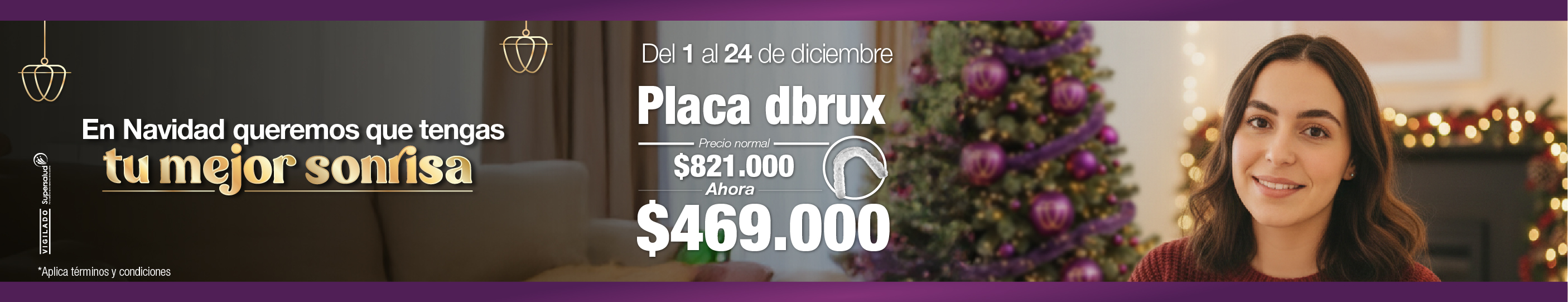 Promoción válida del 1 al 24 de diciembre de 2025. Precio anterior: $821.000. Precio actual: $469.000 para la Placa Neuromiorelajante Dbrux. El descuento aplica para la compra y facturación del 100% del tratamiento. No acumulable con otros descuentos o promociones. No aplica para pagos parciales. Los beneficios no se suman en el mismo procedimiento, pero pueden combinarse con campañas sobre tratamientos diferentes. No acumulable con financiación DFS. Ni Welli tasa cero o subconvencionada. Aplican condiciones y restricciones