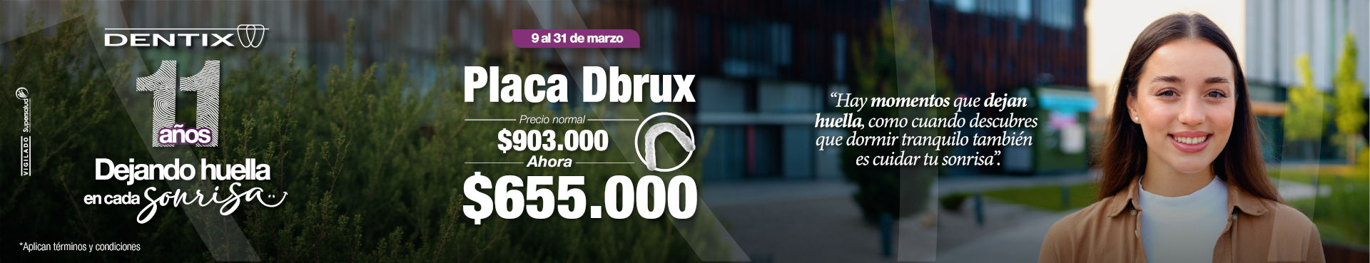 Legales Dbrux: Promoción válida del 9 al 31 de marzo del 2026. Precio anterior: $903.000 Precio actual: $655.000 para la Placa Neuromiorelajante Dbrux. El descuento aplica para la compra y facturación del 100% del tratamiento. No acumulable con otros descuentos o promociones. No aplica para pagos parciales. Los beneficios no se suman en el mismo procedimiento, pero pueden combinarse con campañas sobre tratamientos diferentes. No acumulable con financiación DFS. Ni Welli tasa cero o subconvencionada. Aplican condiciones y restricciones.