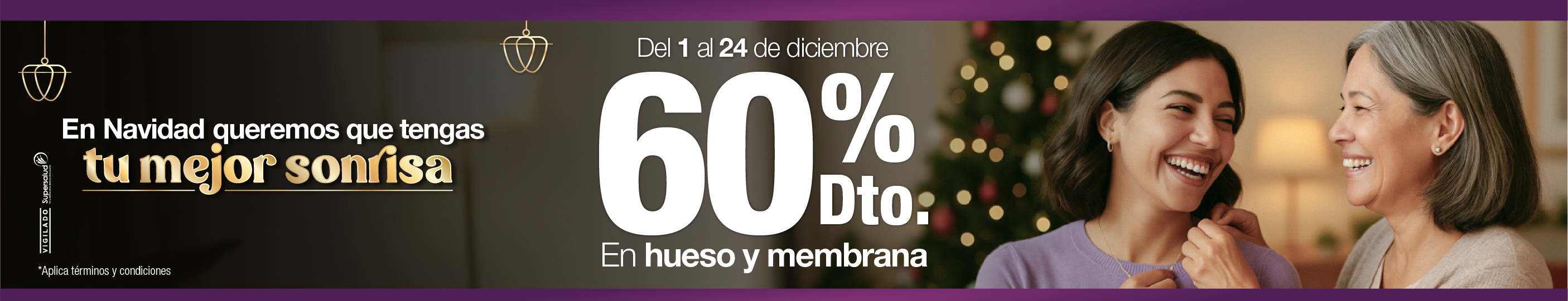 Promoción válida del 1 al 24 de diciembre de 2025. Aplica el 60% de descuento sobre el valor total del tratamiento de injerto de hueso y membrana. El descuento aplica al momento de la compra y facturación del 100% del tratamiento. No acumulable con otras promociones o descuentos. No aplica para pagos parciales. Los beneficios no se suman en el mismo procedimiento, pero pueden combinarse con campañas sobre tratamientos diferentes. No acumulable con financiación DFS, Ni Welli tasa cero o subconvencionada. Aplican condiciones y restricciones.