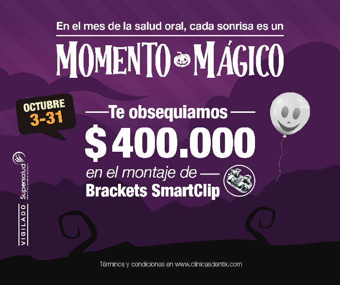 Los $400.000 de descuento aplican en montajes de dos arcadas y estudio cefalométrico. Aplica por la compra de los paquetes de ortodoncia, Brackets de autoligado metálicos Smartclip de 3M para la compra y facturación del 100% del tratamiento. No acumulable con otros descuentos o promociones. No aplica para pagos parciales. Los beneficios no se suman en el mismo procedimiento, pero sí en tratamientos diferentes. No acumulable con financiación DFS. Aplican condiciones y restricciones.