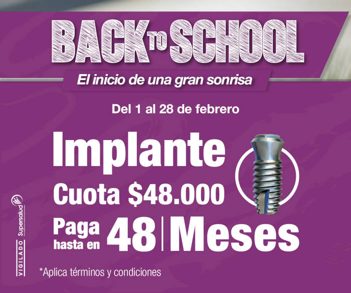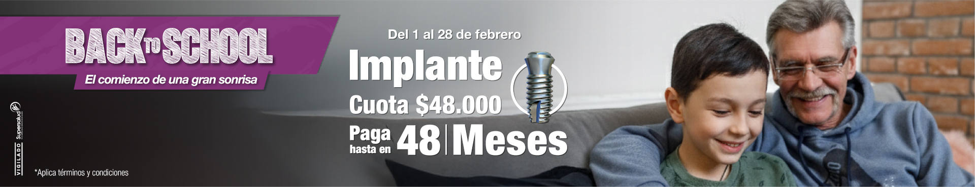 Promoción válida del 1 al 28 de febrero del 2026. aplica para tratamiento de implante dental. Cuota de implante por $48.000 pagando en 48 meses. Monto por financiar $ 1.149.000, en un plazo de 48 meses, valor de la cuota mensual $48.000 a una tasa de 1,829% NMV (equivalente a 24,31% E.A. tasas del mes de enero de 2026.) financiación sujeta a estudio, aprobación y políticas de financiación de cada entidad aliada, de acuerdo con perfil del cliente. No incluye seguro ni aval. La tasa y cuotas aplicables están sujetas a cambios mensuales por parte de los aliados financieros. El valor de la cuota no es compatible con ningún descuento. Aplican condiciones y restricciones. Incluye cirugía de colocación de implante, implante dental de titanio biocompatible, 2da fase quirúrgica, tapón de cicatrización y radiografías de control. No acumulable con financiación DFS. Ni Welli tasa cero o subconvencionada. Aplican condiciones y restricciones.