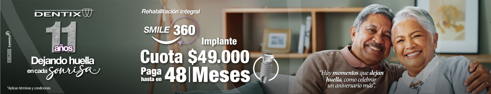 Promoción válida del 1 al 31 de marzo del 2026. Aplica para tratamiento de implante dental. Cuota de implante por $49.000 pagando en 48 meses. Monto por financiar $ 1.149.000, en un plazo de 48 meses, valor de la cuota mensual $49.000 a una tasa de 1,892% NMV (equivalente a 25,23% E.A. tasas del mes de febrero del 2026.) financiación sujeta a estudio, aprobación y políticas de financiación de cada entidad aliada, de acuerdo con perfil del cliente. No incluye seguro ni aval. La tasa y cuotas aplicables están sujetas a cambios mensuales por parte de los aliados financieros. El valor de la cuota no es compatible con ningún descuento. Aplican condiciones y restricciones. Incluye cirugía de colocación de implante, implante dental de titanio biocompatible, 2da fase quirúrgica, tapón de cicatrización y radiografías de control. No acumulable con financiación DFS. Ni Welli tasa cero o subconvencionada. Aplican condiciones y restricciones.