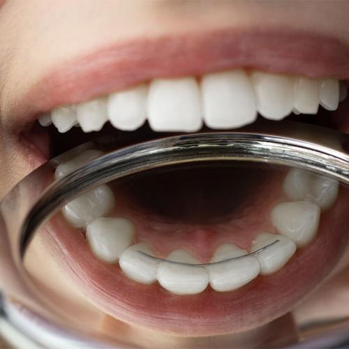 • Férula de ortodoncia transparente siendo colocada sobre los dientes